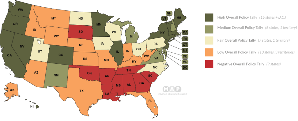 “The Movement Advancement Project (MAP) tracks over 50 different LGBTQ-related laws and policies. This map shows the overall policy tallies (as distinct from sexual orientation or gender identity tallies) for each state, the District of Columbia, and the five populated U.S. territories. A state’s policy tally scores the laws and policies within each state that shape LGBTQ people’s lives, experiences, and equality. The major categories of laws covered by the policy tally include: Relationship & Parental Recognition, Nondiscrimination, Religious Exemptions, LGBTQ Youth, Health Care, Criminal Justice, and Identity Documents.”
