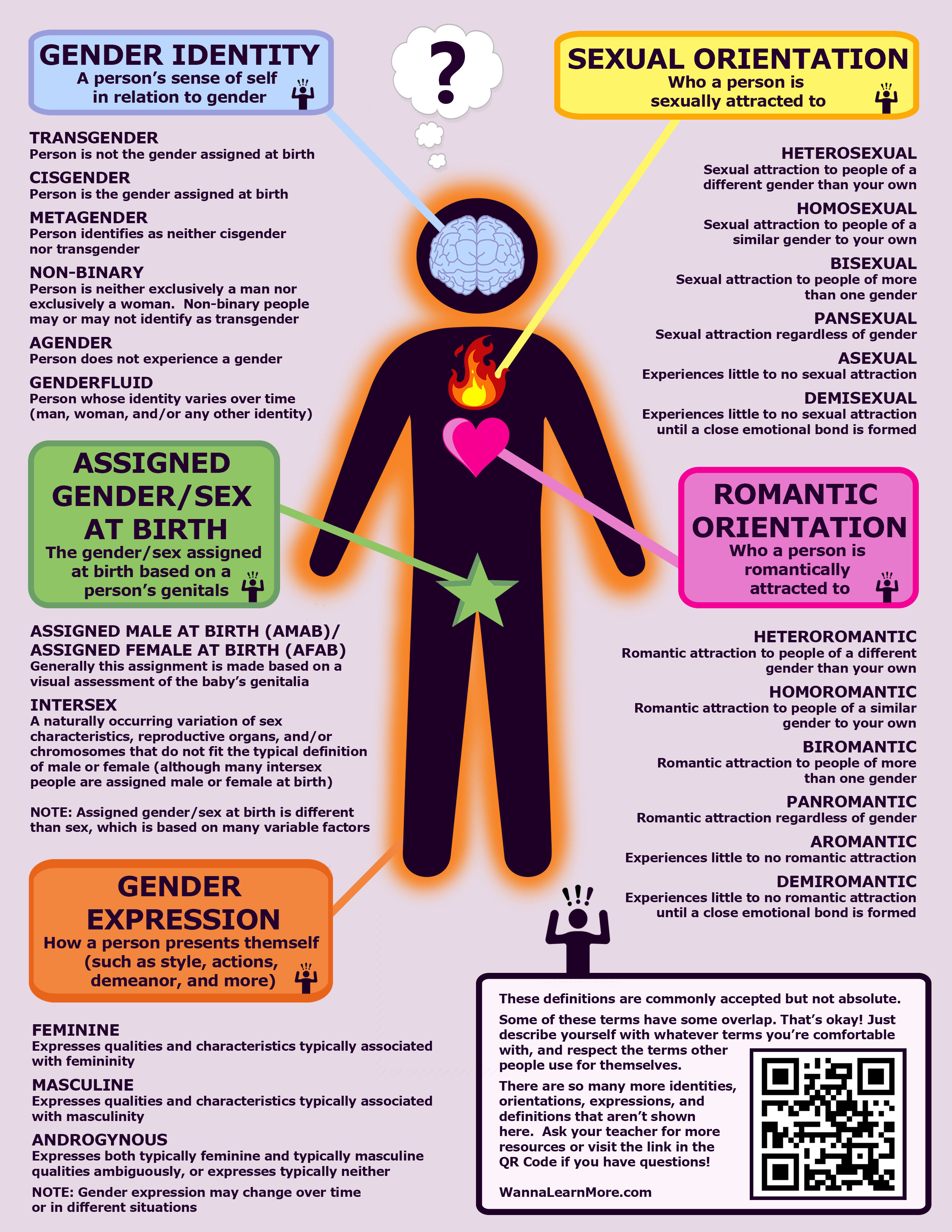 What do these words mean to you? They can be defined in many ways and are not all absolute – some overlap. What is important is how we understand ourselves and others. Create a word association chart like the example on the next photo to define and describe Gender Identity, Assigned Gender, Gender Expression, Sexual Orientation, and Romantic Orientation, and what they mean to you.